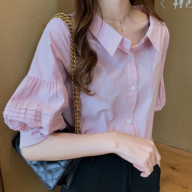【送料無料】 トップス ブラウス ふんわり袖 バルーンスリーブ 襟付き ゆったり キレイめ 上品 シンプル キュート オトナかわいい 半端袖 5分袖 ブルー ホワイト ピンク 青 白 20代 30代 40代 通勤 通学 オフィス お出かけ 春夏