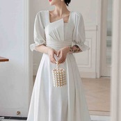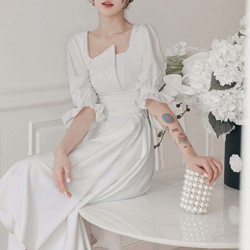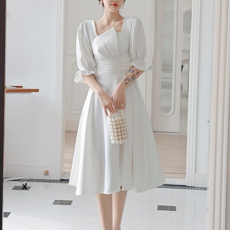 【送料無料】 パーティードレス ワンピース ドレス ハイウエスト ひざ丈 ミディ ミディアム 半袖 袖あり フリル スクエアネック アシンメトリー 白 ホワイト こなれ感 大人可愛い フェミニン シンプル 大きいサイズ 2XL 3XL 10代 20代 30代 お出掛け デート パーティー 2次会 夜デート お呼ばれ