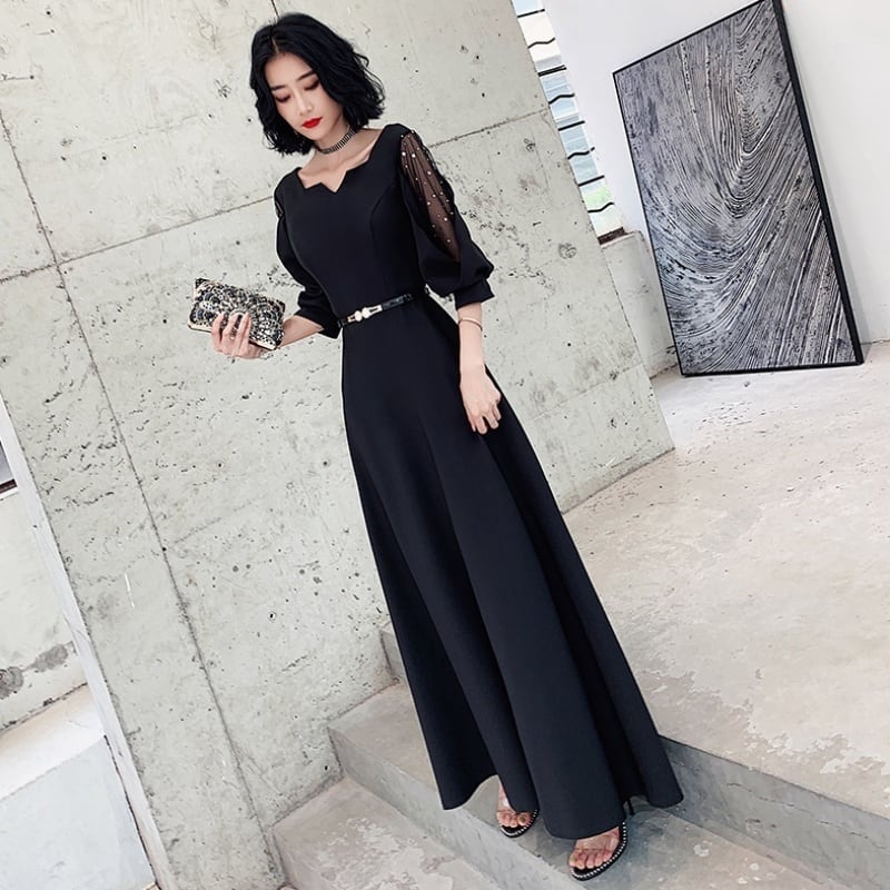 【送料無料】 パーティードレス ワンピース ドレス ハイウエスト ロング 7分袖 袖あり メッシュ シアー 透け感 ヘンリーネック Vネック 黒 ブラック こなれ感 大人可愛い エレガント セクシー シンプル 大きいサイズ 2XL 3XL 10代 20代 30代 お出掛け デート パーティー 2次会 夜デート お呼ばれ