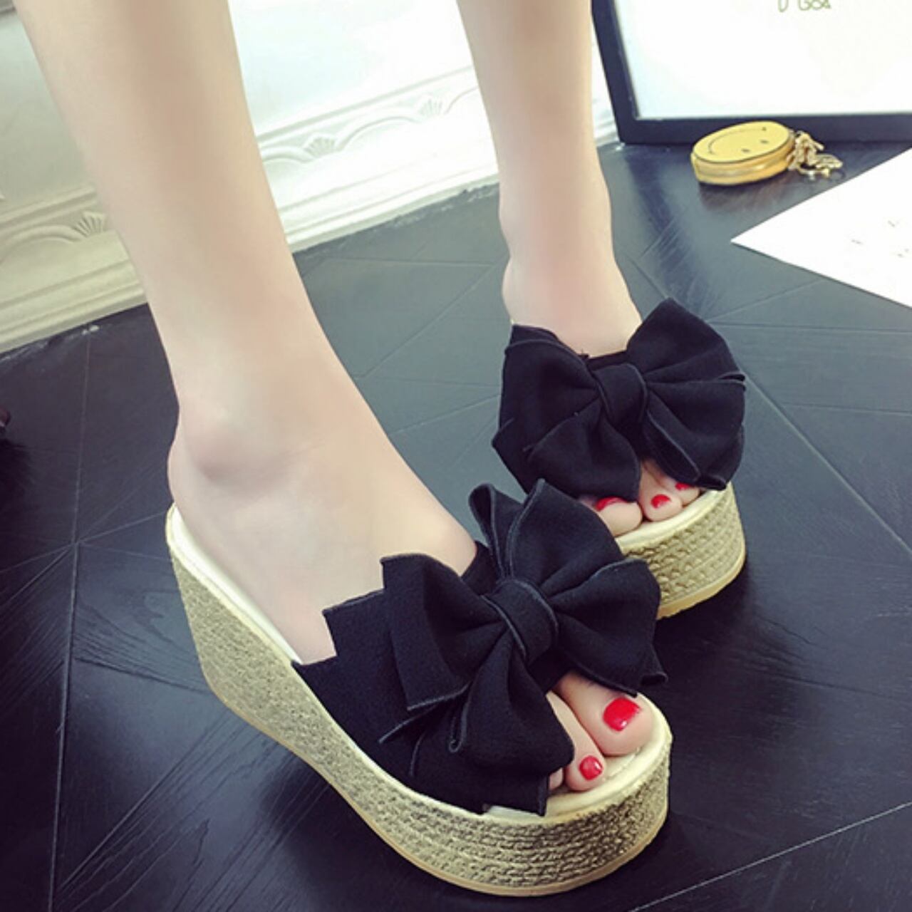 大きなリボンが目をひくウェッジソールサンダル。