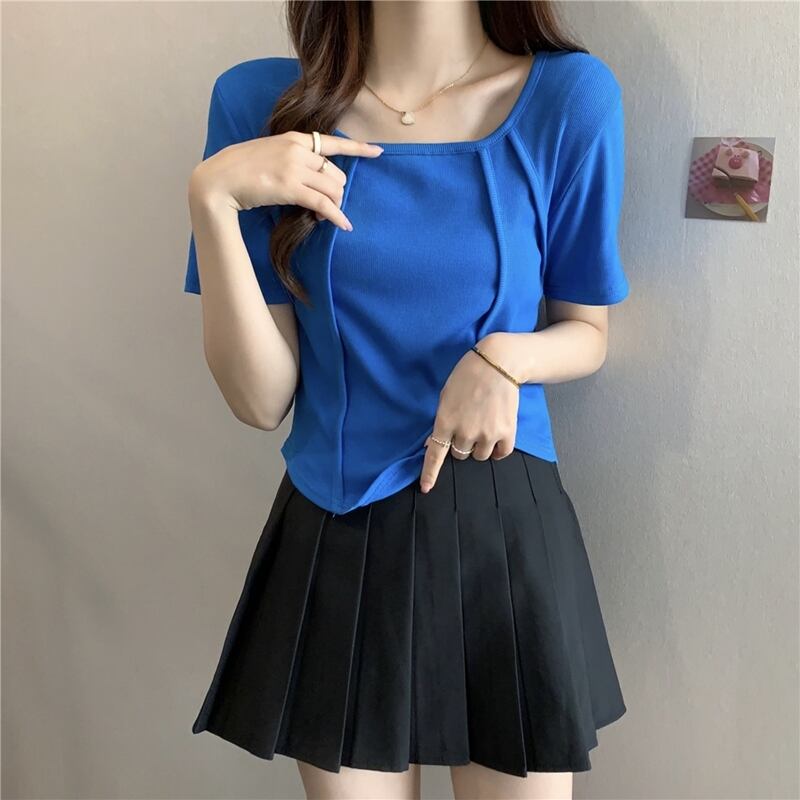 【送料無料】 トップス カットソー スクエアネック タック シンプル 上品 ノーブル キレイめ カジュアル 半袖 ピンク ブルー ホワイト ブラック 青 白 黒 20代 30代 40代 通学 勤通 オフィス お出掛け 春夏
