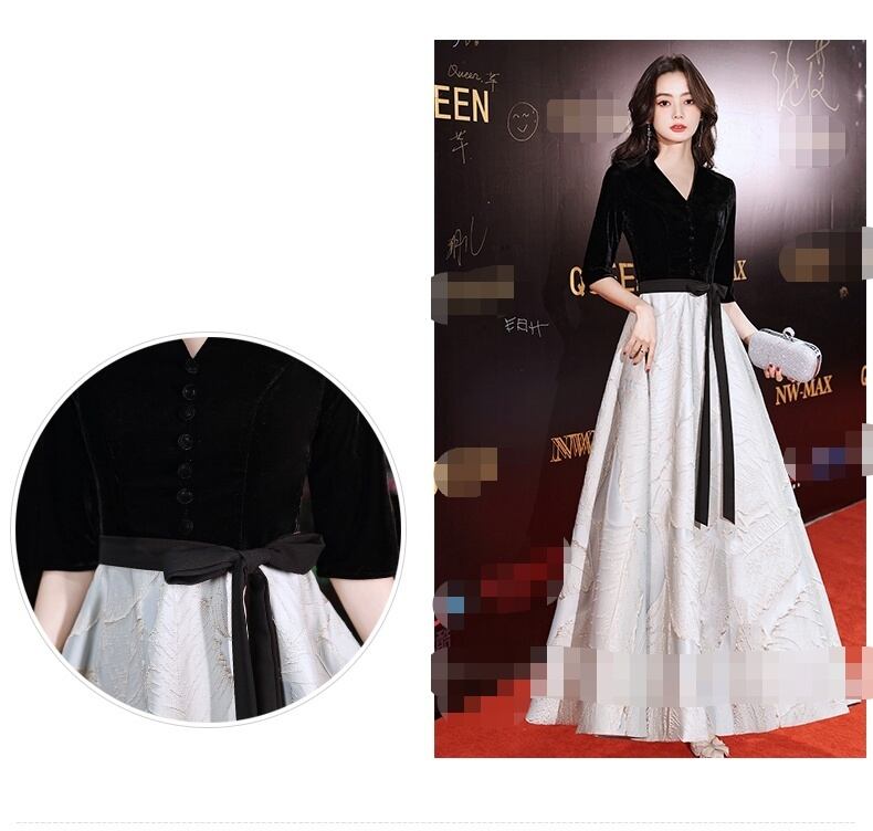 【送料無料】 パーティードレス ワンピース ドレス ハイウエスト ロング マキシ バイカラー 袖あり 7分袖 サイドリボン Vネック Aライン フレア 大人可愛い エレガント 大きいサイズ 2XL 3XL 10代 20代 30代 お出掛け デート パーティー 2次会 夜デート お呼ばれ