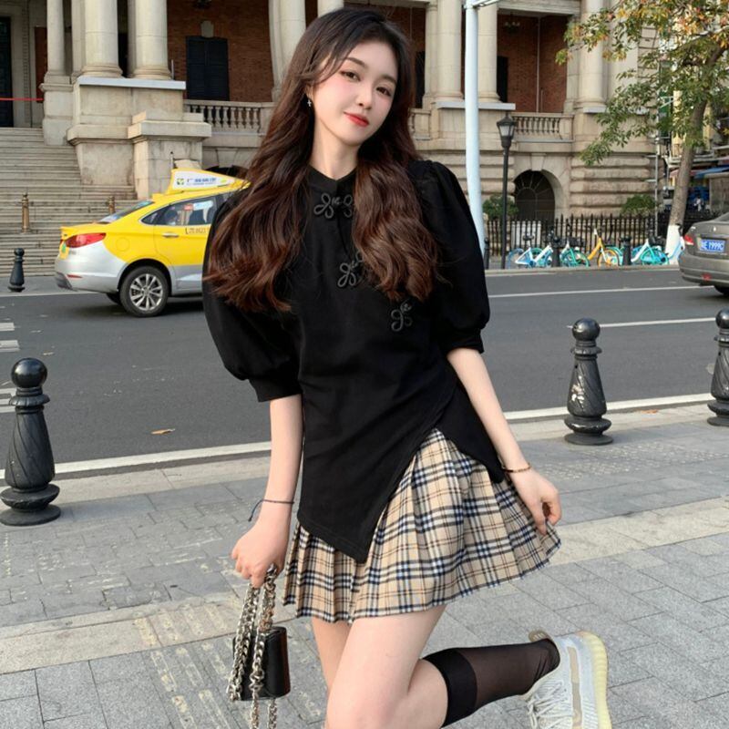 【送料無料】 トップス ブラウス チャイナ ふんわり袖 バルーンスリーブ アシンメトリー こなれ感 アジアテイスト 白 黒 ブラック ホワイト 20代 30代 40代 通勤 通学 お出かけ 春夏