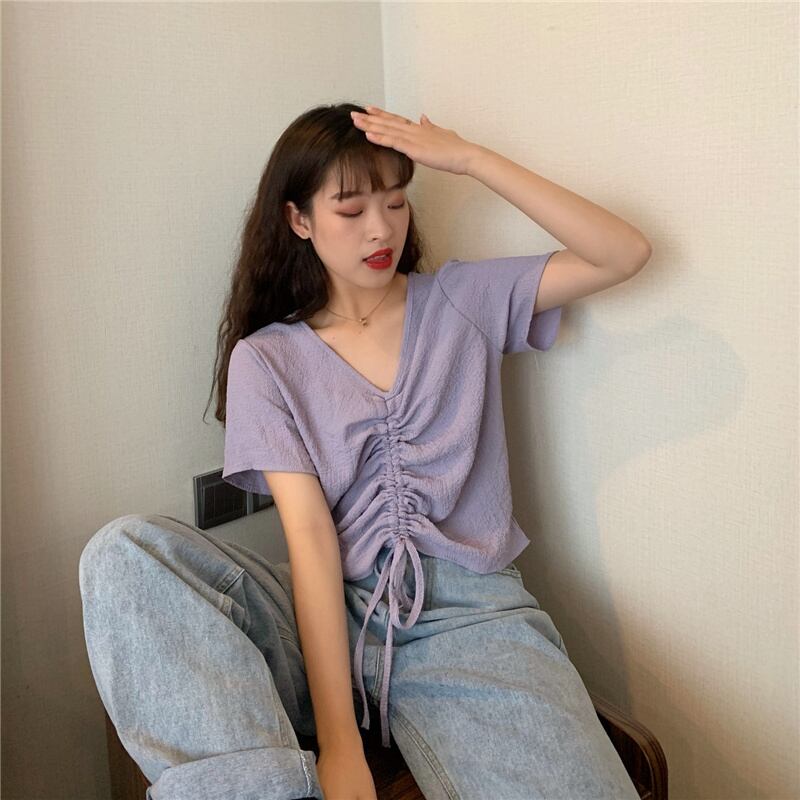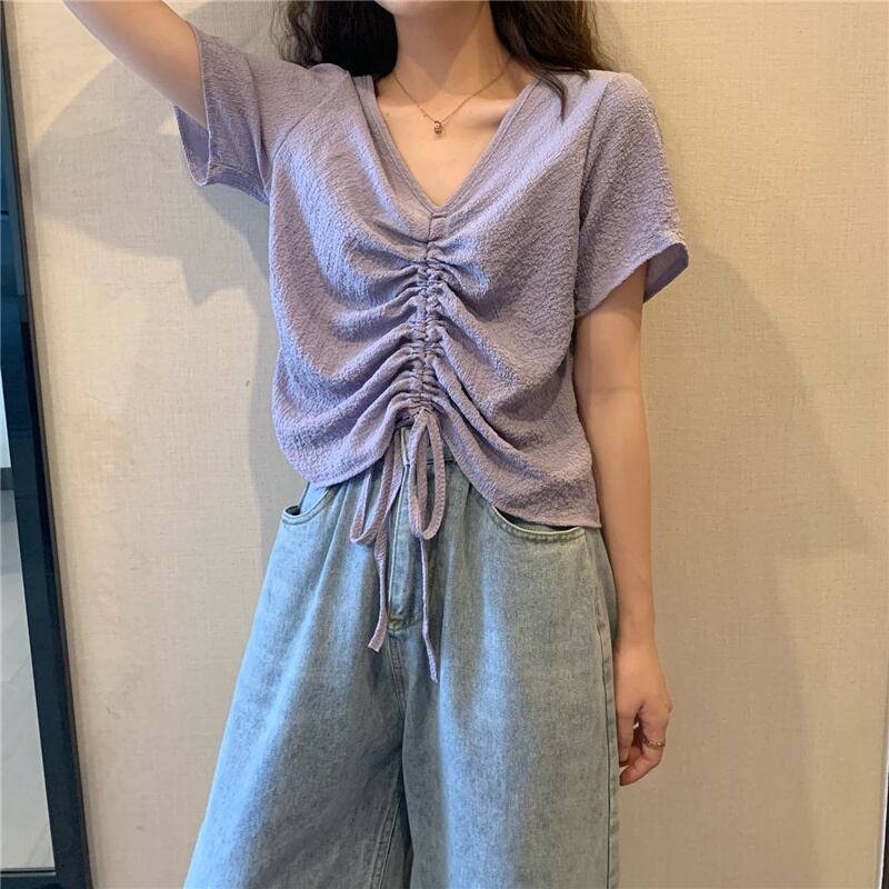 【送料無料】 レディース トップス カットソー シャーリング Vネック シンプル 上品 スタイルアップ 抜け感 カジュアル 半袖 ベージュ オレンジ グリーン パープル 白 緑 紫 20代 30代 40代 通勤 通学 オフィス お出掛け 春夏