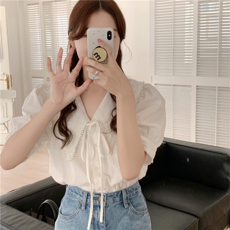 【送料無料】 レディース トップス ブラウス 大きめ襟 リボン 大人かわいい 清楚 上品 レトロ ふんわり袖 クラシカル キュート 半袖 白 ホワイト 20代 30代 通勤 通学 オフィス お出掛け 春夏