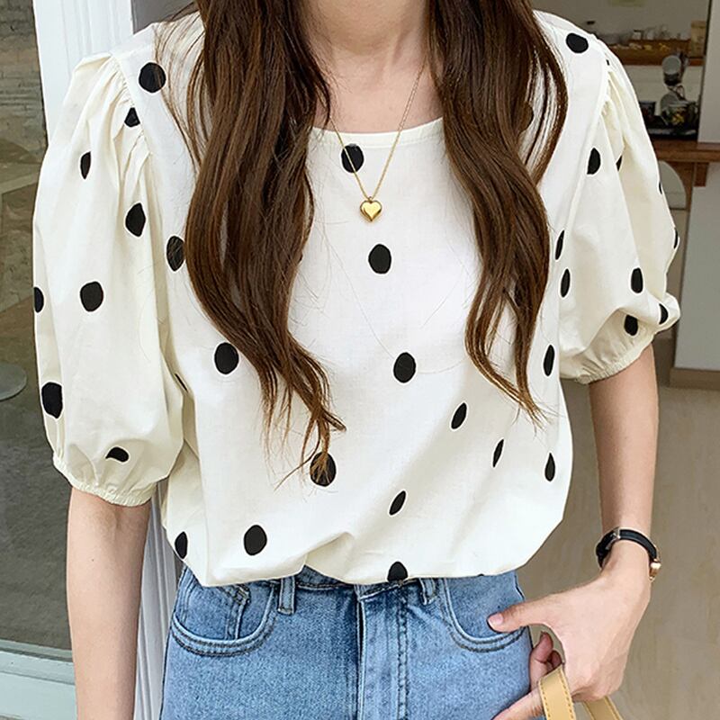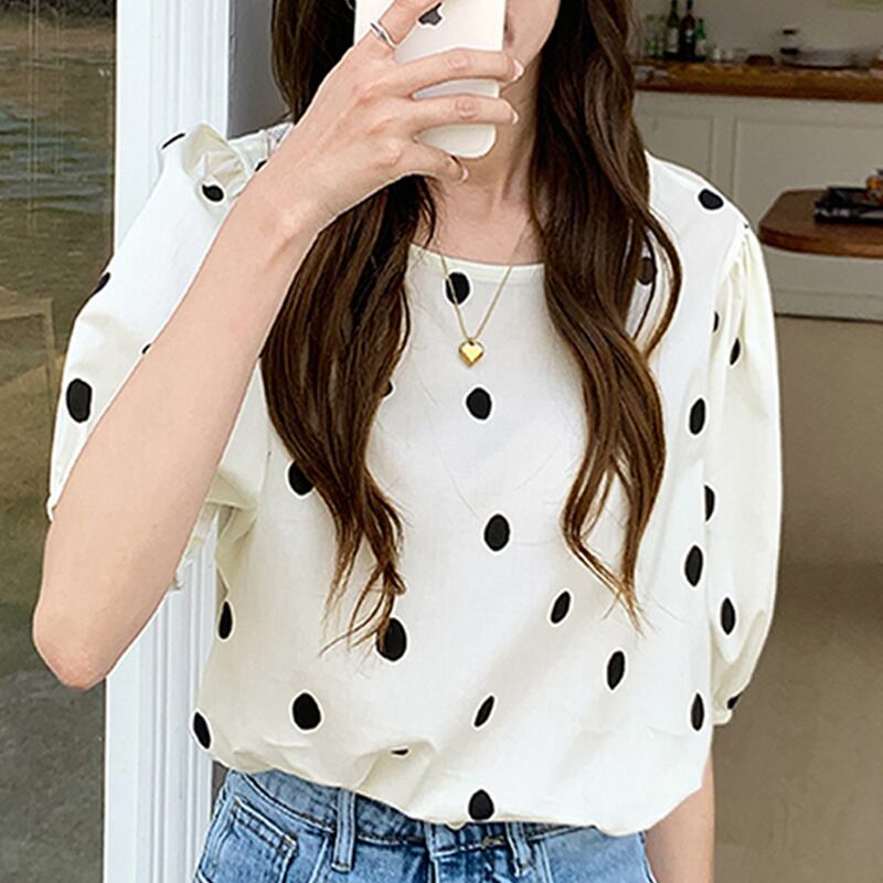 【送料無料】 レディース トップス ブラウス ドット キュート 大人かわいい バルーンスリーブ ふんわり袖 二の腕カバー シンプル かわいい ベーシック モノトーン 白 黒 ホワイト ブラック 半袖 半端袖 5分袖 20代 30代 40代 通勤 通学 オフィス お出掛け 春夏