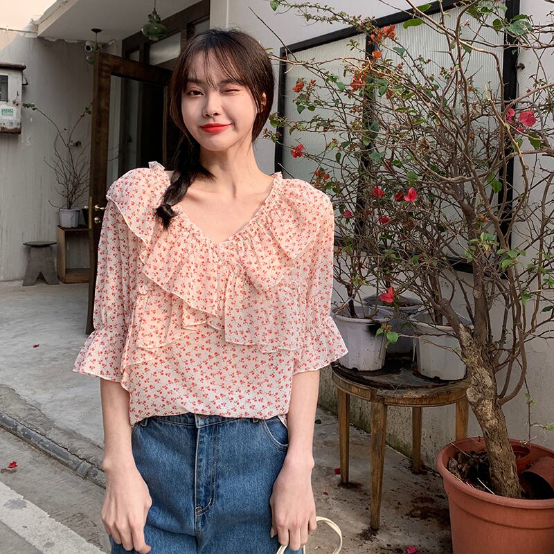 【送料無料】 レディース トップス ブラウス フリル キュート 上品 スウィート プリント 大人かわいい こなれ感 半端袖 5分袖 白 赤 黒 ホワイト レッド ブラック 小花柄 20代 30代 通勤 通学 オフィス お出掛け 春夏