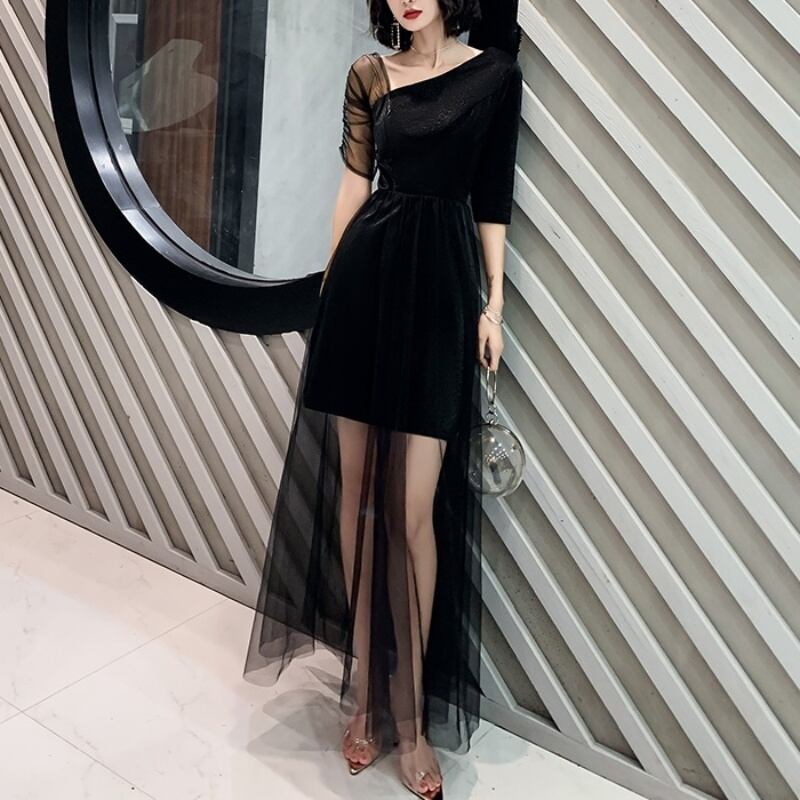 【送料無料】 パーティードレス ワンピース ドレス ロング マキシ レディース ハイウエスト 袖あり 7分袖 Vネック シースルー メッシュ サテン アシンメトリー 大人可愛い セクシー エレガント フォーマル 大きいサイズ 2XL 3XL 10代 20代 30代 ブラック 黒 パーティー 2次会 結婚式 ブライダル ウエディング 夜デート お出かけ ディナー
