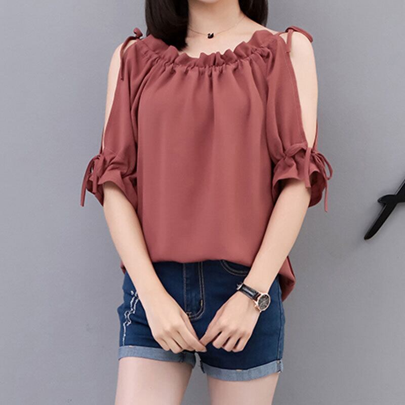 【送料無料】 レディース トップス カットソー オープンショルダー ギャザー リボン こなれ感 カジュアル シンプル 抜け感 おしゃれ レッド ブラック 赤 黒 半袖 半端袖 通勤 通学 お出掛け春夏