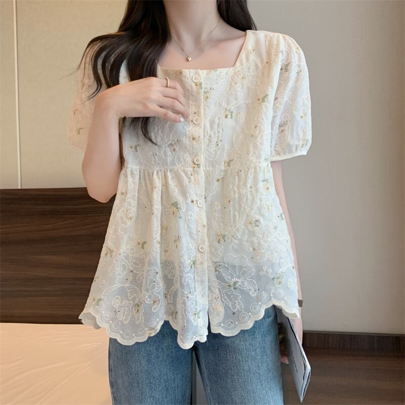 【送料無料】 レディース トップス ブラウス スクエアネック ふんわり袖 パフスリーブ フラワー エンブロイダリー 刺繍 体型カバー 清楚 上品 ガーリー 大人かわいい キレイめ シンプル シアー 透け感 20代 30代 40代 通勤 通学 オフィス お出掛け 春夏