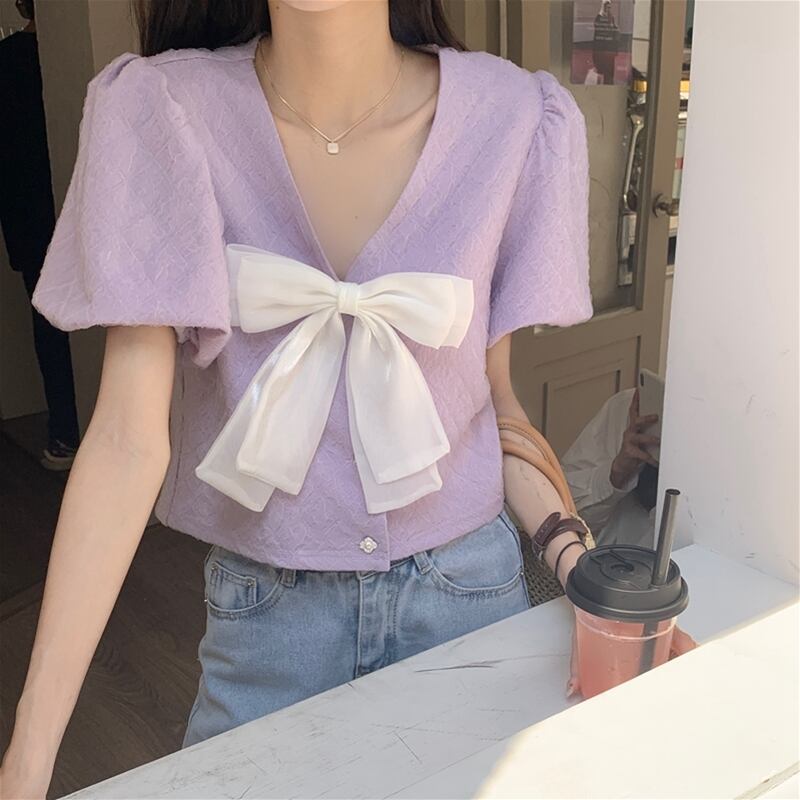 【送料無料】 レディース トップス ブラウス カットソー リボン シフォン 清楚 ふんわり袖 バルーンスリーブ Vネック キュート シンプル 半袖 パープル ブラック 紫 黒 20代 30代 通勤 通学 オフィス お出掛け 春夏