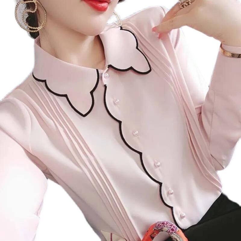 【送料無料】 レディース トップス ブラウス パイピング タック ピンタック パール キュート レトロ 上品 ノーブル シンプル 長袖 イエロー ホワイト ピンク ブルー グリーン 黄色 白 水色 青 緑 キレイめ 20代 30代 40代 通勤 通学 オフィス お出掛け 女子会 お呼ばれ 秋冬