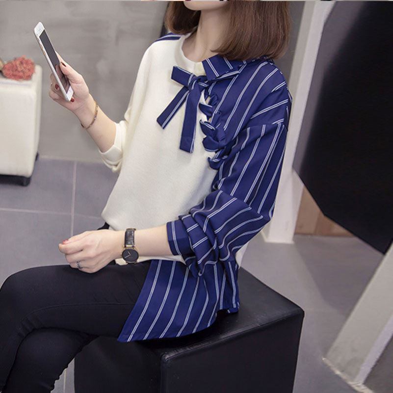 【送料無料】 レディース トップス ブラウス カットソー アシンメトリー カラー切り替え リボン 大人かわいい おしゃれ ストライプ シンプル きれいめ 上品 ブルー ネイビー 青 水色 紺 長袖 20代 30代 40代 通勤 通学 オフィス お出掛け 女子会 お呼ばれ 秋冬