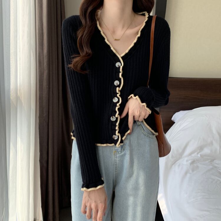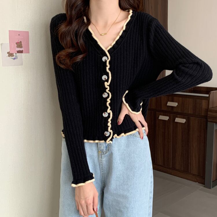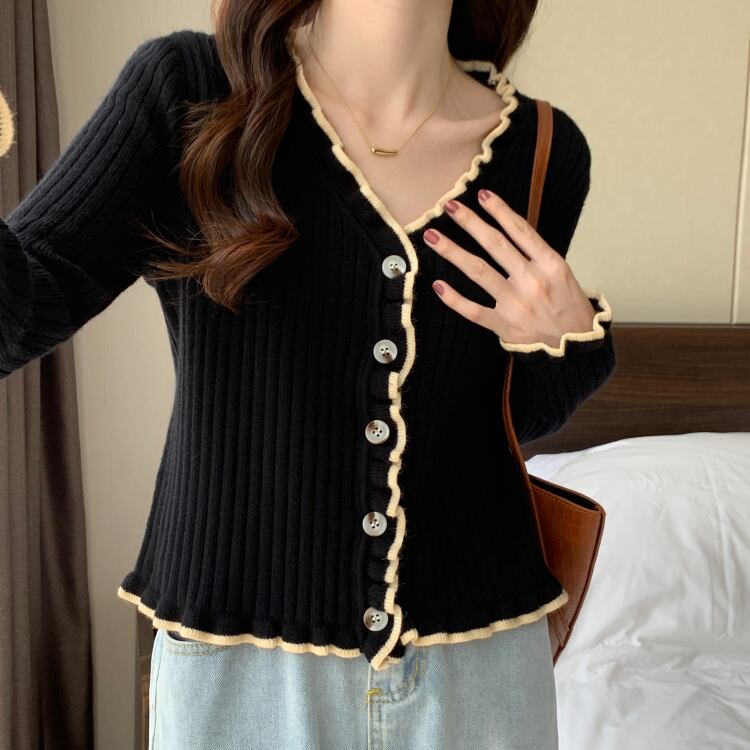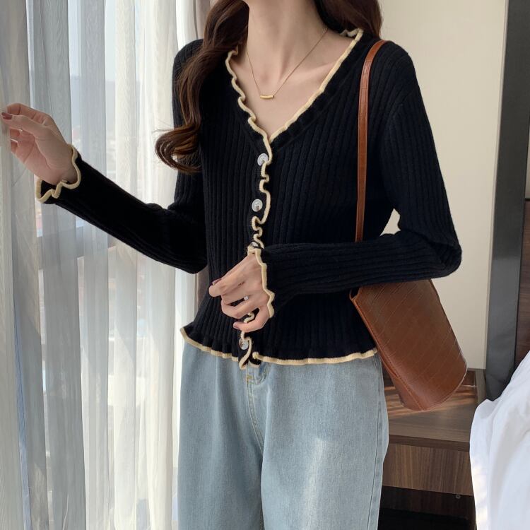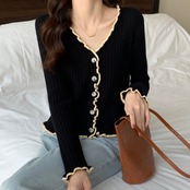 【送料無料】 レディース トップス ニット 羽織り カーディガン フリル シンプル カラー切り替え 縁取り きれいめ 上品 カジュアル 長袖 黒 ブラック 20代 30代 40代 通勤 通学 オフィス お出掛け 女子会 お呼ばれ 秋冬
