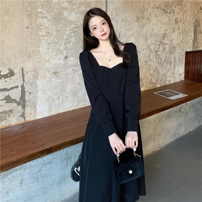 【送料無料】 レディース ワンピース ワンピドレス ひざ下 ミディアム丈 袖あり 長袖 スクエアネック フレア Aライン 大人可愛い きれいめ シンプル カジュアル 大人 上品 おしゃれ お洒落 大人女子 こなれ感 主役級 存在感 とろみ感 無地 秋 冬 10代 20代 30代 女性用 ママ デート お出かけ 女子会 休日 着回し 普段使い 韓国 韓国系 楽ちん モテ 定番 M L 2XL 3XL 4XL 大きいサイズ 大きい 大きめ ビッグサイズ 大人カラー 秋カラー 黒 ブラック