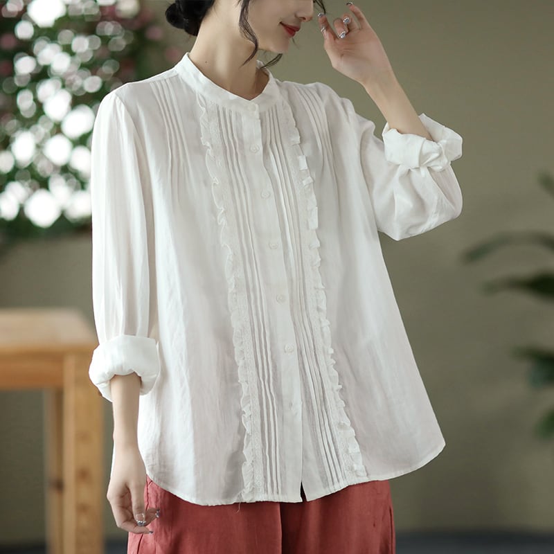 【送料無料】 レディース トップス ブラウス 襟なし スタンドカラー バンドカラー レース ゆったり 体型カバー 大きいフリーサイズ 長袖 ホワイト 白 20代 30代 40代 通勤 通学 オフィス お出掛け 女子会 お呼ばれ 秋冬