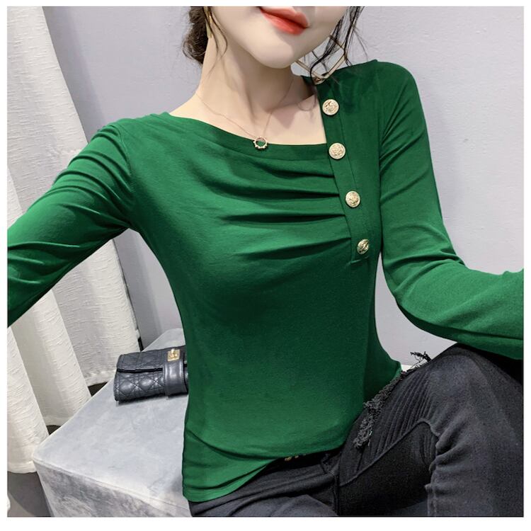 【送料無料】 レディース トップス カットソー アシンメトリー ゴールド タック シンプル カジュアル こなれ感 きれいめ 抜け感 長袖 グリーン レッド ブラック 緑 赤 黒 20代 30代 40代 通勤 通学 オフィス お出掛け 女子会 お呼ばれ 秋冬