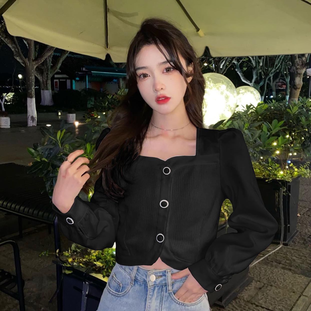 【送料無料】 レディース トップス ブラウス スクエアネック ふんわり袖 きれいめ クロップド スタイルアップ 体型カバー シンプル カジュアル 長袖 ホワイト ブラック 白 黒 20代 30代 40代 通勤 通学 オフィス お出掛け 女子会 お呼ばれ 秋冬