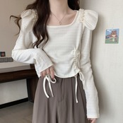 【送料無料】 レディース トップス カットソー ブラウス フリル レース シャーリング キュート フェミニン ガーリー 大人可愛い 上品 シンプル きれいめ 長袖 ベージュ ブラック 黒 20代 30代 通勤 通学 お出掛け 女子会 お呼ばれ 秋冬