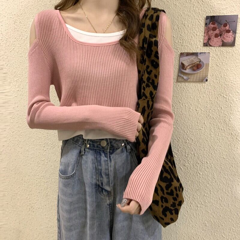 【送料無料】 レディース トップス カットソー レイヤード 重ね着 クロップド カラー切り替え 長袖 シンプル カジュアル 肩見せ オープンショルダー リブ ホワイト ピンク グレー ブラック 白 黒 20代 30代 40代 通勤 通学 お出掛け 女子会 お呼ばれ 秋冬 春