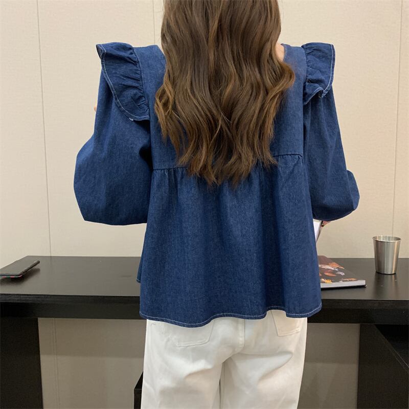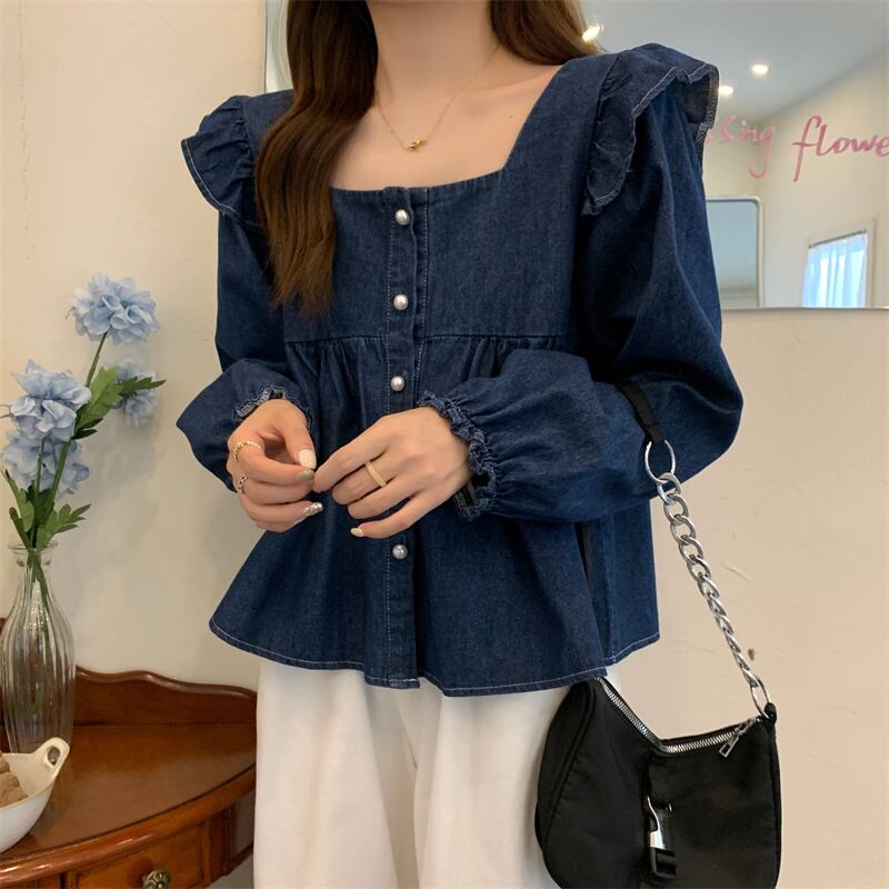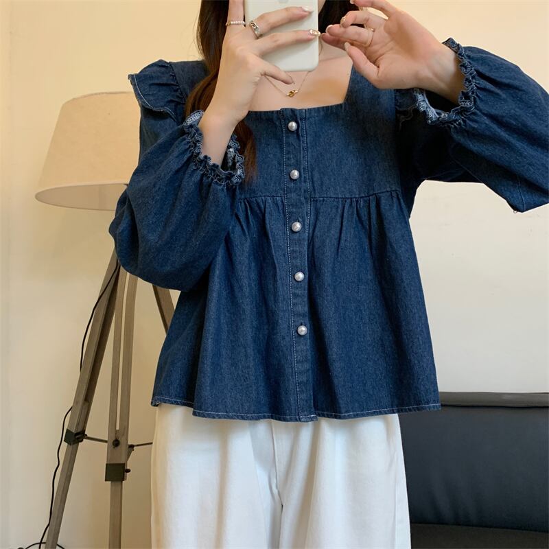 【送料無料】 レディース トップス ブラウス スクエアネック フリル シンプル キュート カジュアル デニム チュニック 体型カバー きれいめ ガーリー 長袖 ブルー 青 インディゴ 20代 30代 40代 通勤 通学 お出掛け 女子会 お呼ばれ 秋冬
