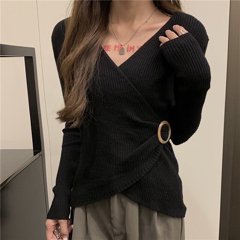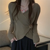 【送料無料】 レディース トップス カットソー カシュクール アシンメトリー Vネック シンプル カジュアル きれいめ 大人かわいい すっきり スタイルアップ リブ おしゃれ 長袖 コーヒーブラウン ブラック 茶 黒 20代 30代 40代 通勤 通学 オフィス お出掛け 女子会 お呼ばれ 秋冬
