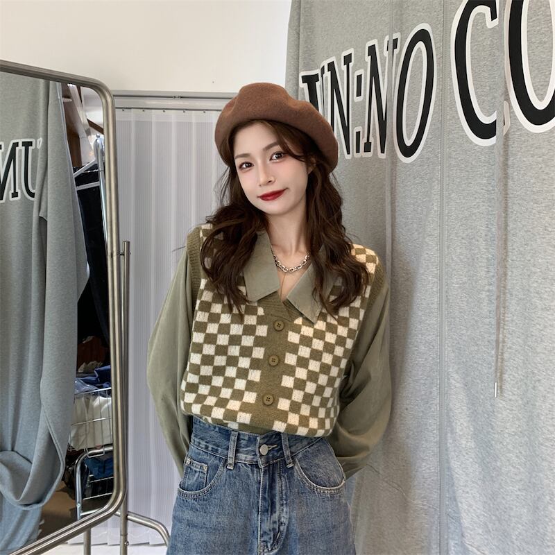 【送料無料】 レディース トップス ブラウス ニット ハイブリット 異素材 キュート 大人かわいい 上品 コーデ チェック カジュアル 長袖 緑 グリーン 20代 30代 40代 通勤 通学 オフィス お出掛け 女子会 お呼ばれ 秋冬