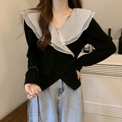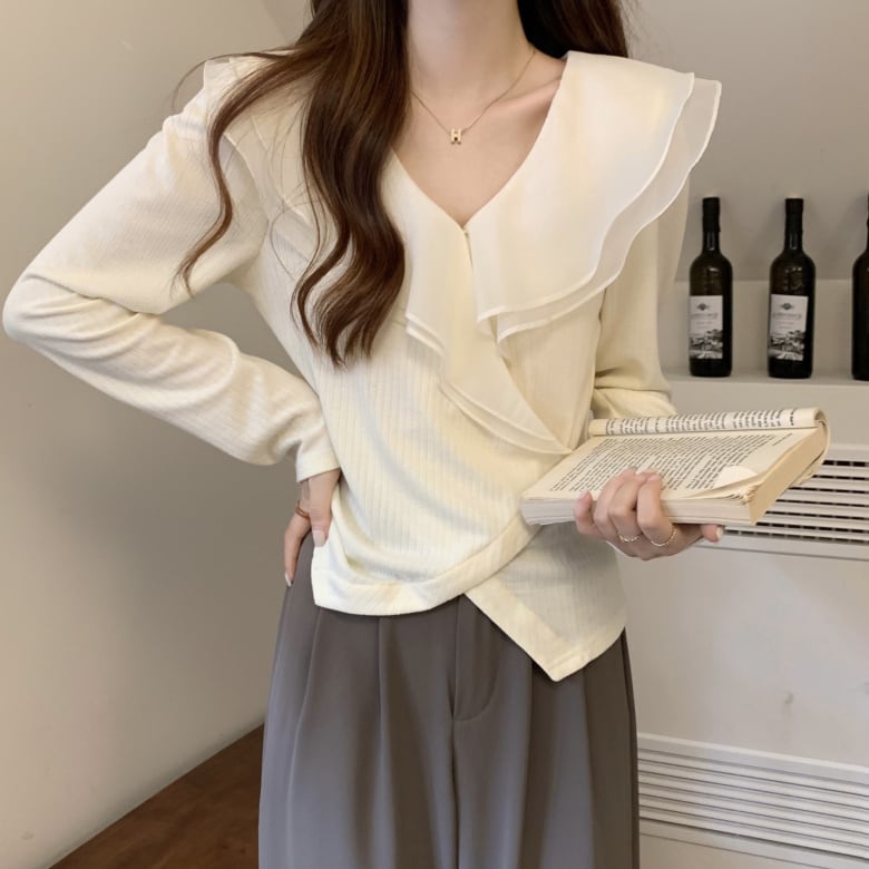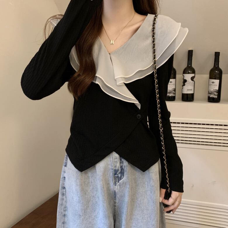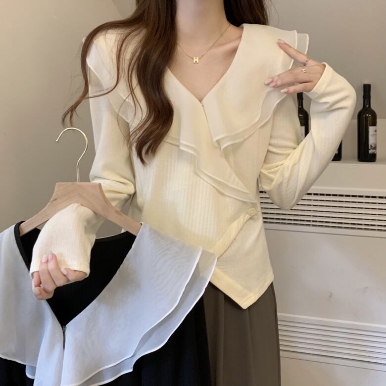 【送料無料】 レディース トップス カットソー フリル レース キュート 可愛い 大人かわい 上品 きれいめ ショート丈 スタイルアップ 長袖 ブラック ベージュ 黒 オフホワイト 20代 30代 40代 通勤 通学 オフィス お出掛け 女子会 お呼ばれ 秋冬