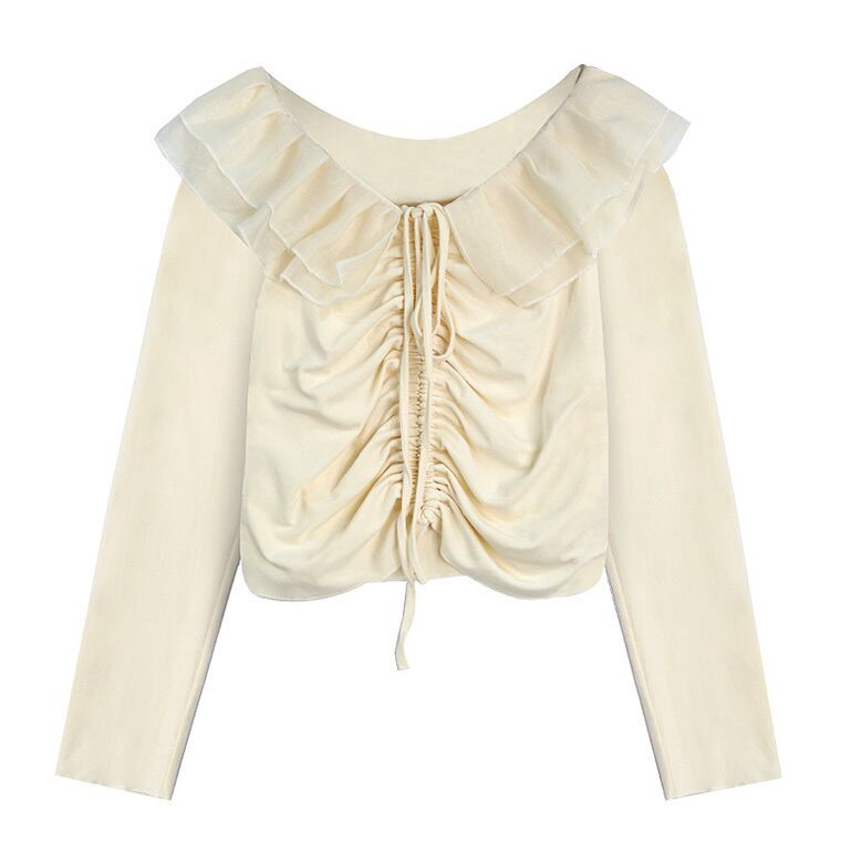 【送料無料】 レディース トップス カットソー フリル レース フェミニン スウィート シャーリング ギャザー 大人かわいい シンプル カジュアル ショート丈 ヘビロテ 長袖 ブラック ベージュ 黒 20代 30代 40代 通勤 通学 オフィス お出掛け 女子会 お呼ばれ 秋冬