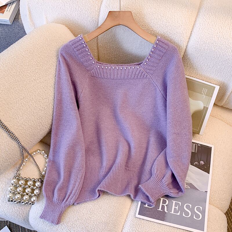 【送料無料】 レディース トップス ニット スクエアネック パール 上品 シンプル ショート丈 クロップド キレイめ 大人かわいい カジュアル 長袖 ホワイト グリーン パープル 白 緑 紫 20代 30代 40代 通勤 通学 オフィス お出掛け 女子会 お呼ばれ 秋冬