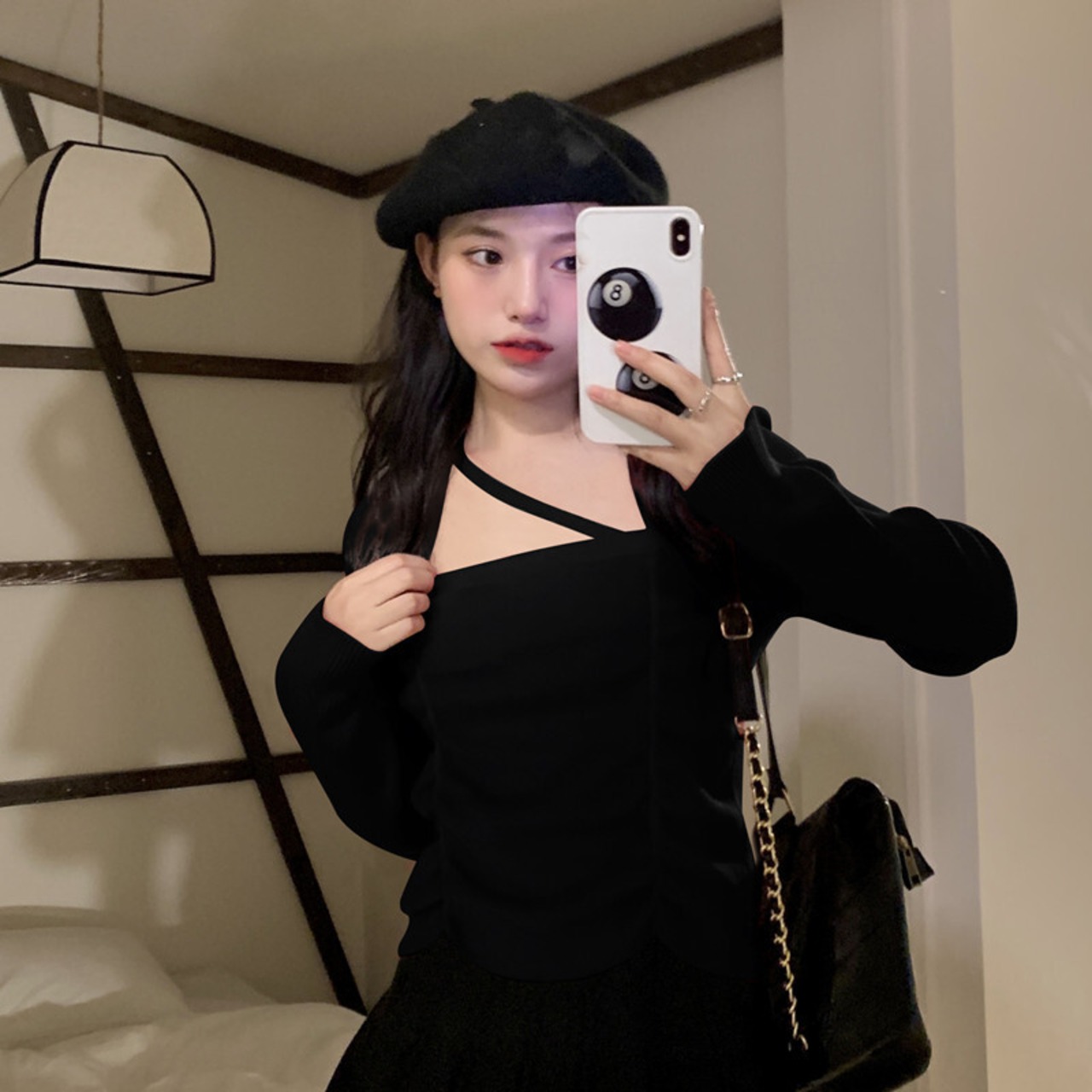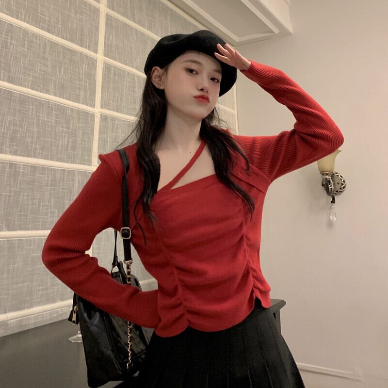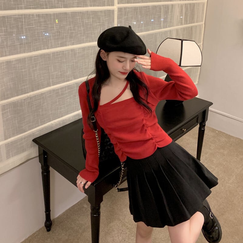 【送料無料】 レディース トップス ニット アシンメトリー スクエアネック シャーリング キレイめ ショート丈 こなれ感 大人かわいい カジュアル 長袖 レッド ブラック 赤 黒 20代 30代 40代 通勤 通学 お出掛け 女子会 お呼ばれ 秋冬