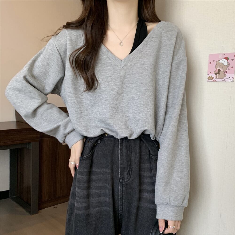 【送料無料】 レディース トップス カットソー Vネック 重ね着風 抜け感 シンプル カジュアル おしゃれ ゆったり 体型カバー リラックス 長袖 グレー ブラック 黒 20代 30代 40代 通勤 通学 お出掛け 女子会 お呼ばれ 秋冬