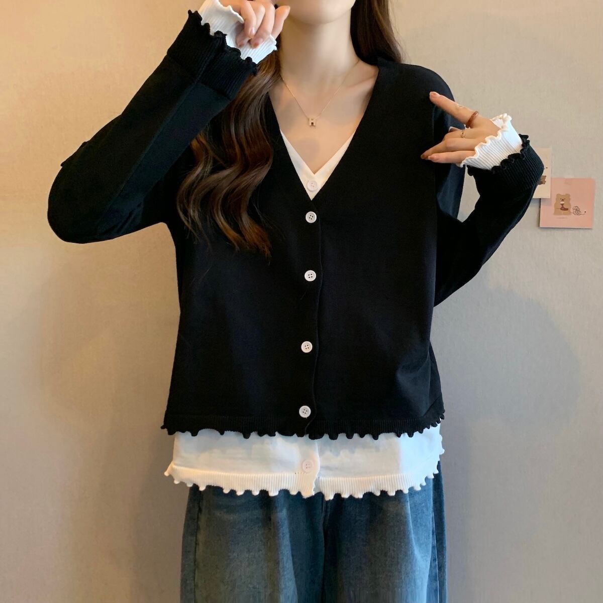 【送料無料】 レディース トップス カットソー 重ね着風 レイヤード レース 大人かわいい シンプル Vネック カジュアル きれいめ 長袖 モノトーン ブラック ホワイト 黒 白 20代 30代 40代 通勤 通学 オフィス お出掛け 女子会 お呼ばれ 秋冬 春