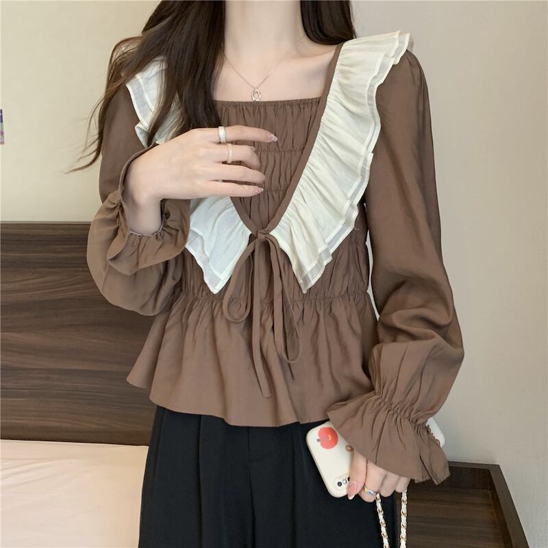 【送料無料】 レディース トップス カットソー フリル キュート カジュアル きれいめ スウィート 大人かわいい フリル袖 ギャザー 体型カバー 長袖 ブラウン ブラック 茶 黒 20代 30代 40代 通勤 通学 オフィス お出掛け 女子会 お呼ばれ 秋冬