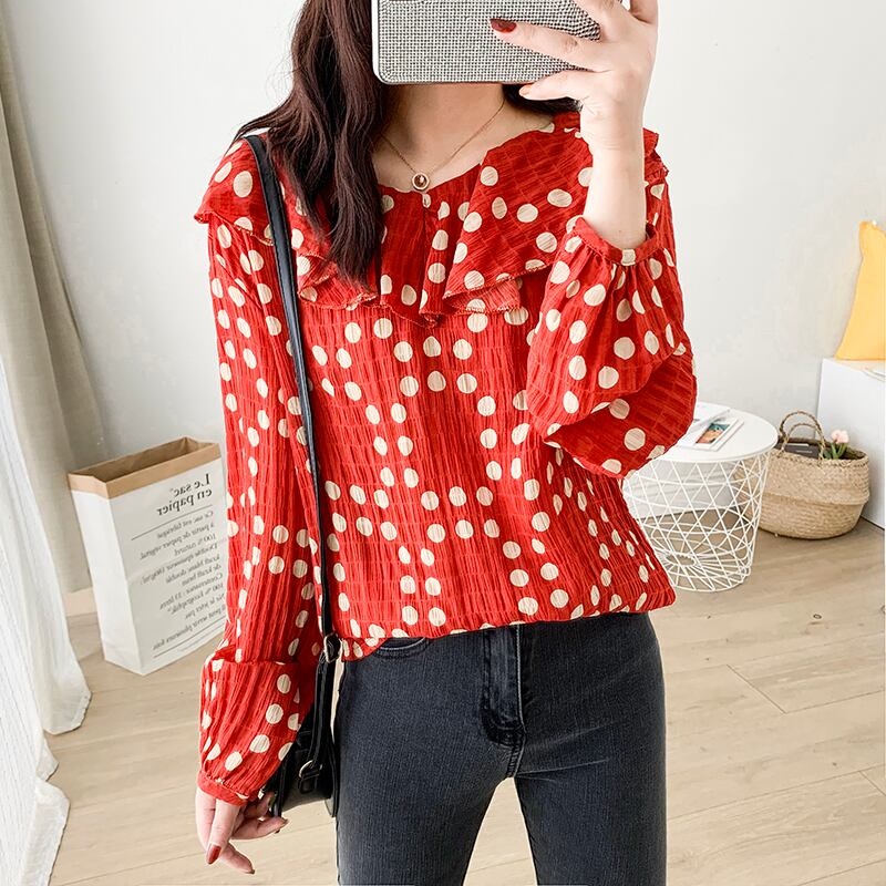 【送料無料】 レディース トップス ブラウス ふんわり袖 ゆったり ドット プリント フリル 大人かわいい こなれ感 上品 清楚 きれいめ シンプル カジュアル 長袖 レッド ベージュ 赤 20代 30代 40代 通勤 通学 オフィス お出掛け 女子会 お呼ばれ 春夏