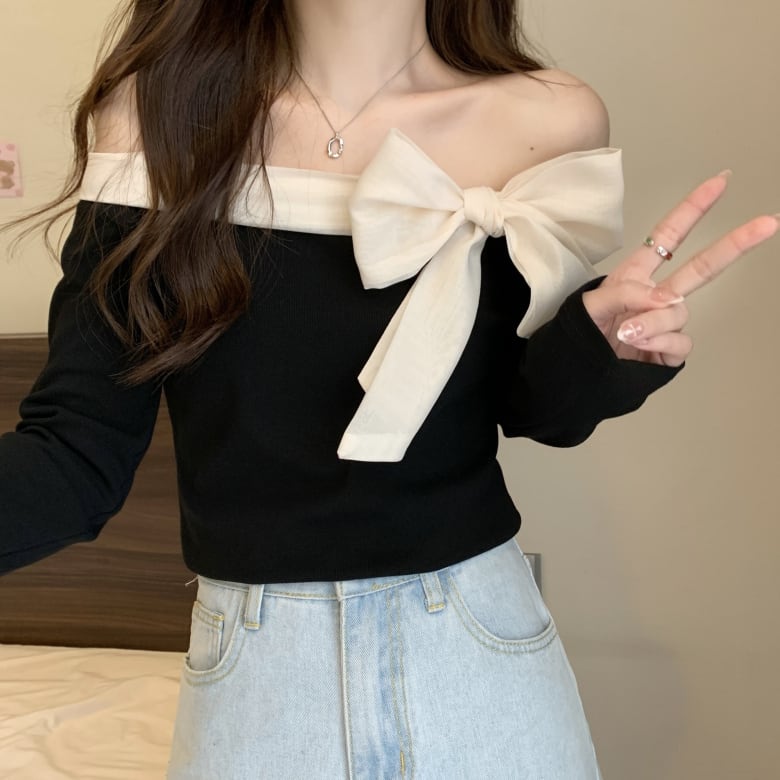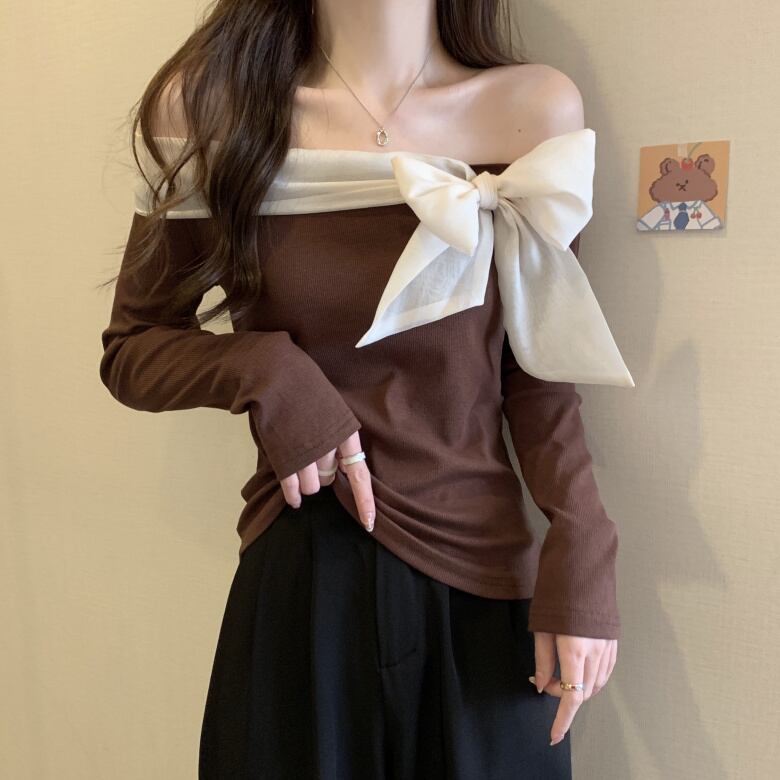 【送料無料】 レディース トップス カットソー ワンショルダー オフショルダー リボン セクシー カジュアル シンプル 華奢見せ セレブ こなれ感 大人かわいい 長袖 ブラウン ブラック 茶色 黒 20代 30代 40代 通勤 通学 オフィス お出掛け 女子会 お呼ばれ 春夏