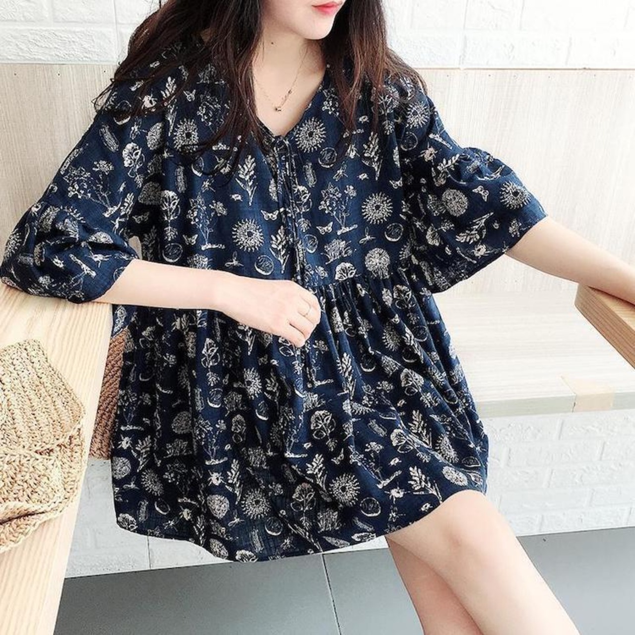 【送料無料】 レディース トップス ブラウス チュニック Vネック 植物 ボタニカルプリント ふんわり袖 ギャザー リボン 体型カバー 半袖 ネイビー 紺 20代 30代 40代 通勤 通学 オフィス お出掛け 女子会 お呼ばれ 春夏