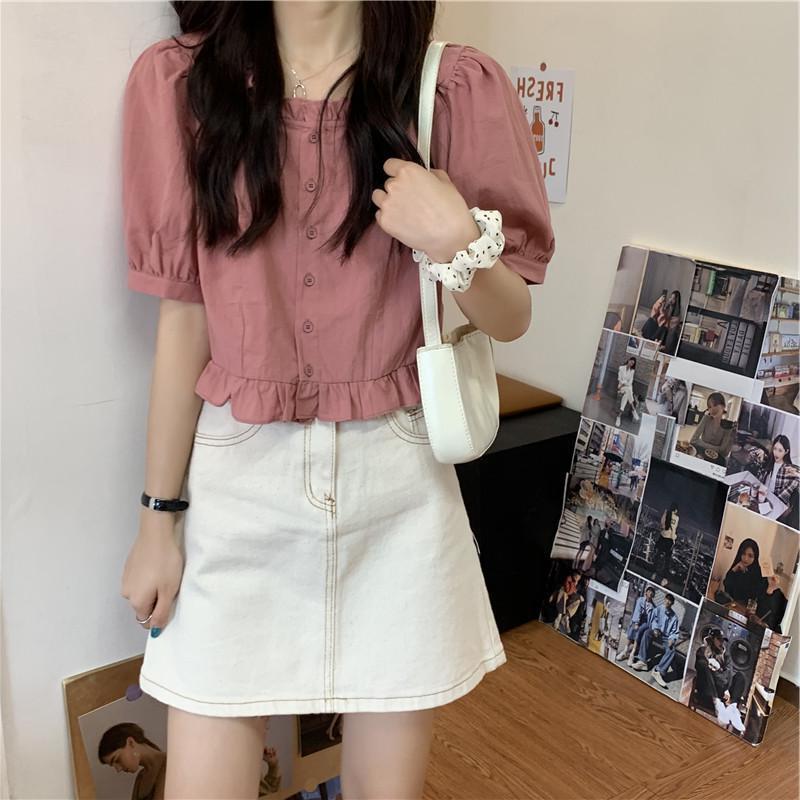 【送料無料】 レディース トップス ブラウス フリル スクエアネック ショート丈 クロップド ふんわり袖 パフスリーブ キュート 上品 シンプル きれいめ 抜け感 大人かわいい 半袖 イエロー ピンク ホワイト 黄色 白 20代 30代 40代 通勤 通学 オフィス お出掛け 女子会 お呼ばれ 春夏