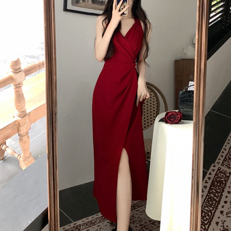【送料無料】 レディース ドレス パーティードレス 肩出し セクシー カシュクール風 スリット きれいめ ロング丈 タイト きれいめ 大人可愛い 大人 リボン シンプル ノースリーブ レッド 赤 結婚式 2次会 お呼ばれ パーティー お食事会 ディナー ランチ お出かけ 春夏