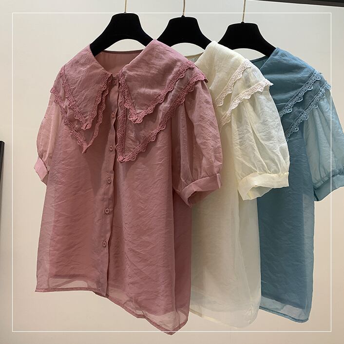 【送料無料】 レディース トップス ブラウス フリル 大きめ襟 キュート スウィート シアー 透け感 レトロ ガーリー ロマンチック 大人かわいい 上品 きれいめ 半袖 ピンク ブルー 青 20代 30代 40代 通勤 通学 オフィス お出掛け 女子会 お呼ばれ 春夏
