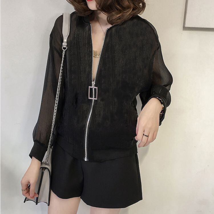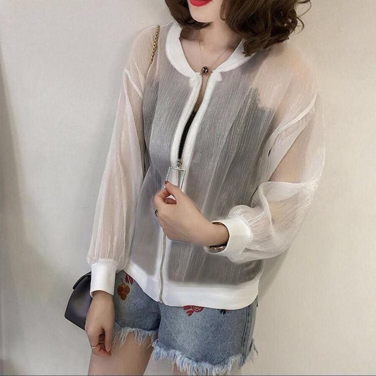 【送料無料】 レディース アウター 羽織 ジャケット ブルゾン ジャンパー フルジップ 透け感 シアー 紫外線対策 重ね着 冷房対策 長袖 ホワイト ブラック 20代 30代 40代 通勤 通学 オフィス お出掛け 女子会 お呼ばれ 春夏