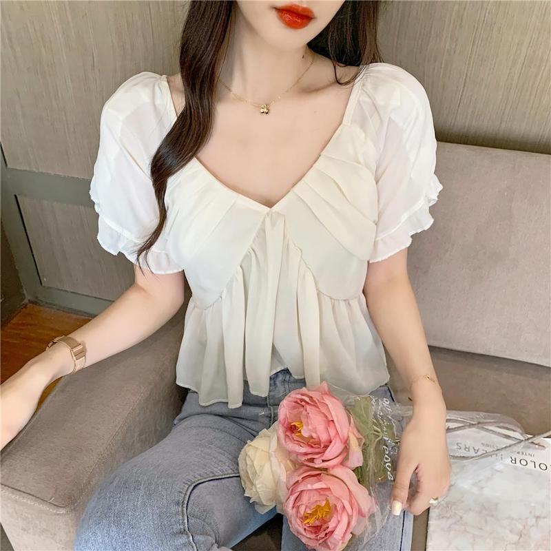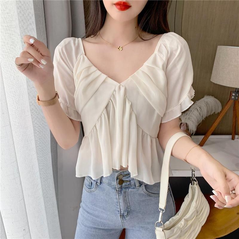 【送料無料】 レディース トップス ブラウス ギャザー フリル タック Vネック キレイめ カジュアル シンプル 体型カバー ショート丈 クロップド こなれ感 大人かわいい ふんわり袖 抜け感 半袖 ベージュ 20代 30代 40代 通勤 通学 オフィス お出掛け 女子会 お呼ばれ 春夏