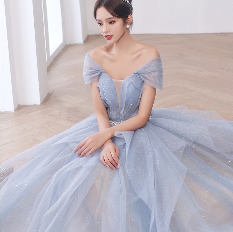 【送料無料】 レディース ドレス パーティードレス ワンピース ロング丈 ミモレ丈 ベアトップ レース プリンセス オフショルダー シアー くすみカラー Aライン 水色 ペールブルー 結婚式 2次会 お呼ばれ パーティー お食事会 ディナー ランチ お出かけ 春夏