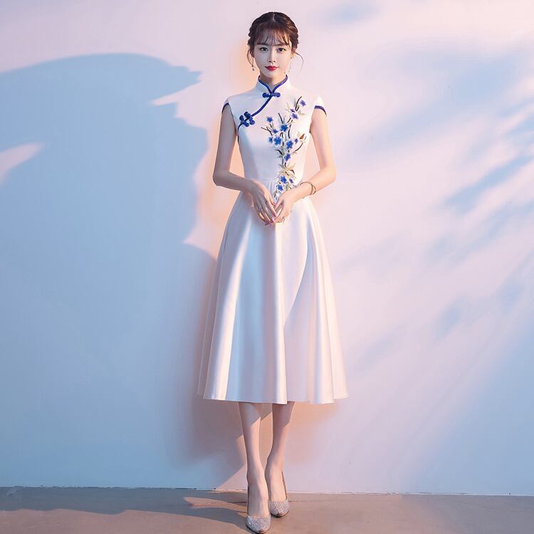 【送料無料】 レディース ドレス パーティードレス ワンピース ミモレ丈 ミドル丈 ひざ下 Aライン チャイナドレス フラワー ボタニカル シンプル 清楚 アシンメトリー キレイめ 大人かわいい ホワイト 白 結婚式 2次会 お呼ばれ パーティー お食事会 ディナー ランチ お出かけ 春夏