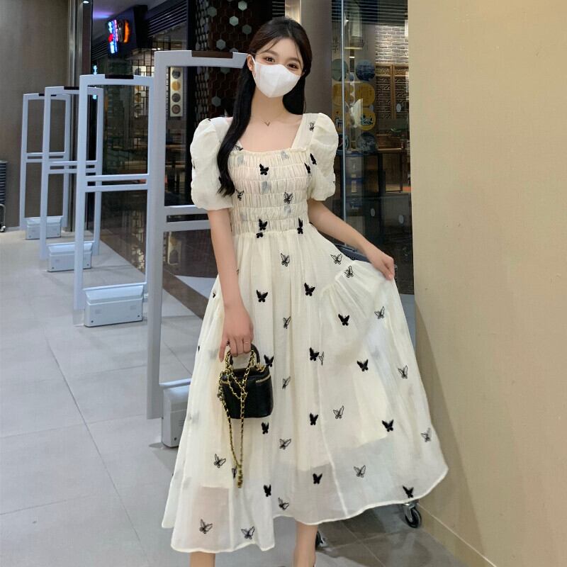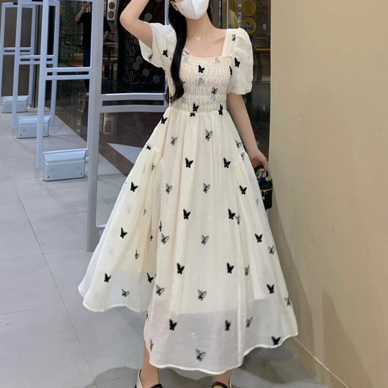 【送料無料】 レディース ワンピース ロング丈 水玉 蝶 バタフライ スクエアネック キュート フェミニン シャーリング 大人かわいい Aライン ふんわり 透け感 半袖 ふんわり袖 モノトーン ベージュ ブラック 20代 30代 40代 通勤 通学 お出掛け 女子会 お呼ばれ 春夏