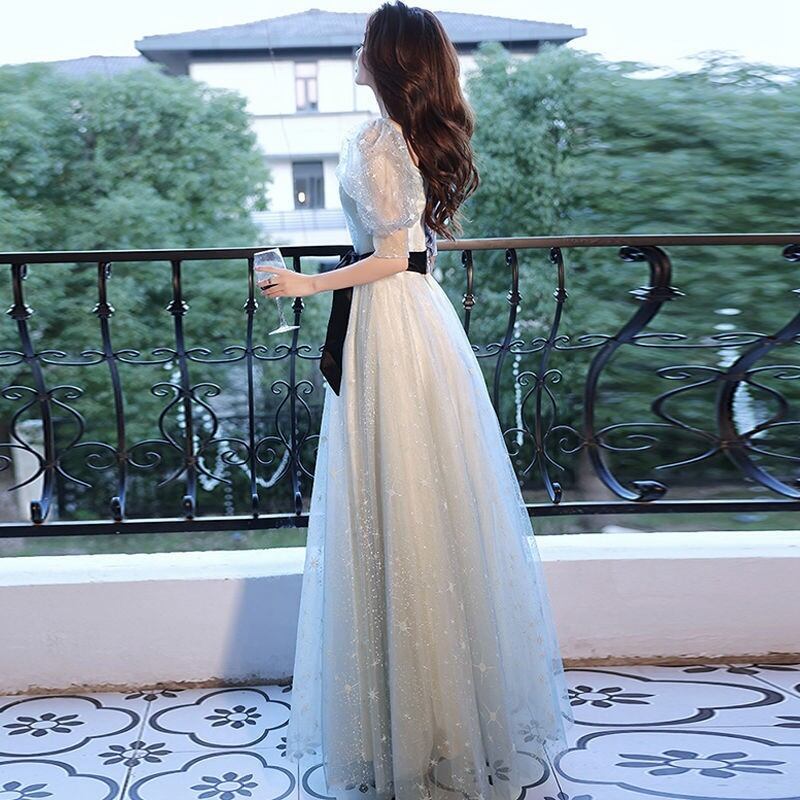 【送料無料】 レディース ドレス パーティードレス ワンピース Aライン キュート 大人かわいい Aライン ロング丈 マキシ丈 レース 上品 半袖 半端袖 ブルー ペールブルー 水色 結婚式 2次会 お呼ばれ パーティー お食事会 ディナー ランチ お出かけ 春夏