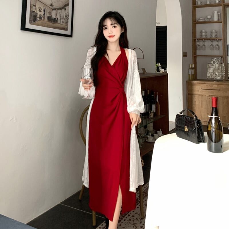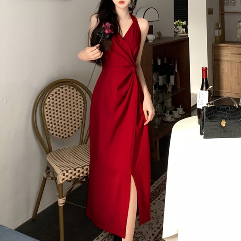 【送料無料】 レディース ドレス パーティードレス ワンピース アシンメトリー ロング丈 マキシ丈 ドレープ 大人かわいい シック エレガント 大人 ノースリーブ リボン こなれ感 レッド 赤 結婚式 2次会 お呼ばれ パーティー お食事会 ディナー ランチ お出かけ 春夏