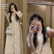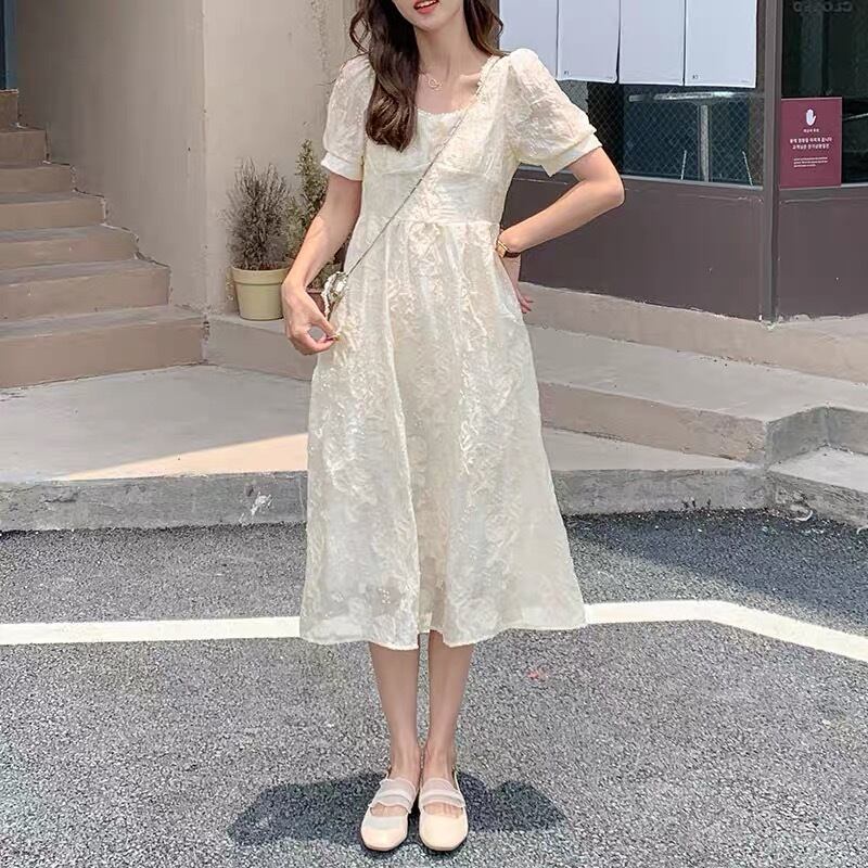 【送料無料】 レディース ドレス パーティードレス ワンピース フェミニン ミドル丈 膝下丈 ミモレ丈 ふんわり袖 Aライン アイボリー 結婚式 2次会 お呼ばれ パーティー お食事会 ディナー ランチ お出かけ 春夏