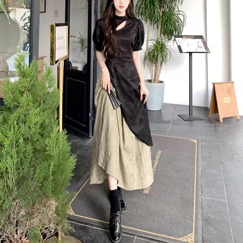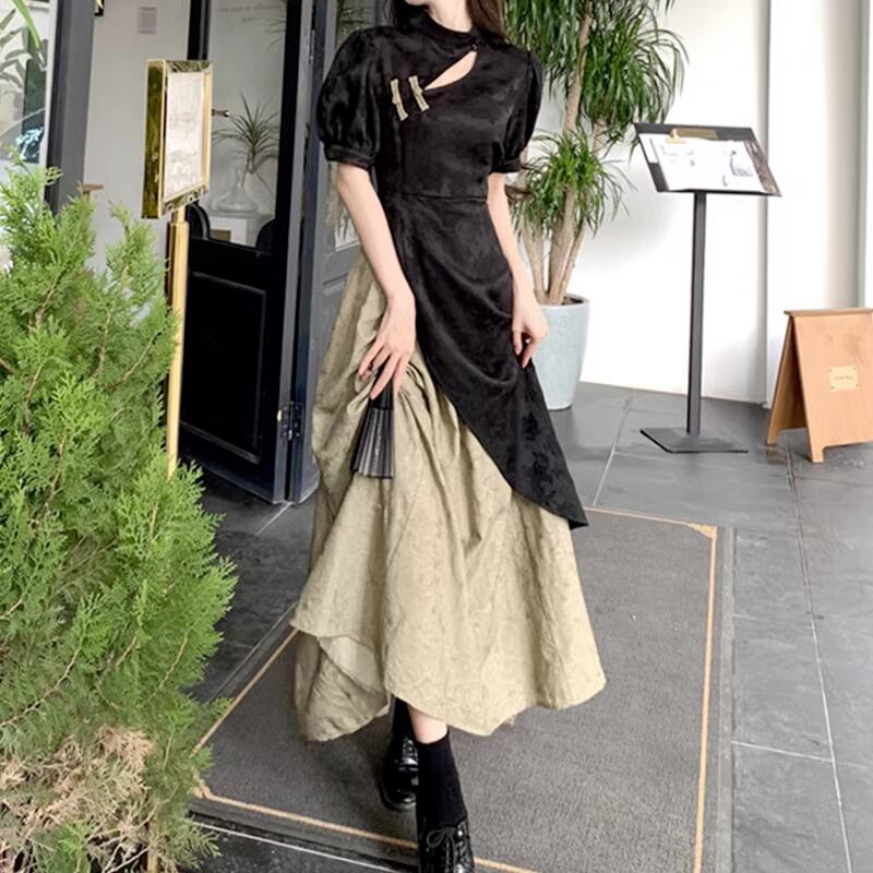 【送料無料】 レディース ドレス パーティードレス ワンピース ロング丈 Iライン フィットアンドフレア 重ね着 カラー切り替え アシンメトリー こなれ感 大人かわいい ブラック 黒 結婚式 2次会 お呼ばれ パーティー お食事会 ディナー ランチ お出かけ 春夏