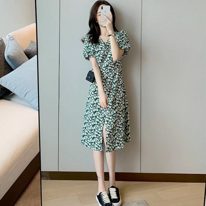 【送料無料】 レディース ワンピース ミドル丈 ミディ丈 Vネック シンプル きれいめ 大人かわいい フラワー ボタニカル カシュクール風 こなれ感 ふんわり袖 Aライン スリット 半袖 グリーン 緑 20代 30代 40代 通勤 通学 オフィス お出掛け 女子会 お呼ばれ 春夏